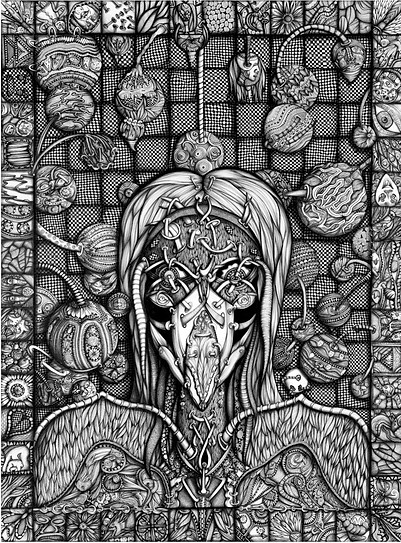 Bird with Orbs is stunning — visually balanced, masterfully composed, rich in pattern. And yet… it’s not comforting. That paradox — the simultaneous pull of beauty and emotional violence — creates a sense of awe and unease. At first glance, the winged figure appears birdlike, but look closer and it becomes disturbingly humanoid: there are eyes, hair, even the vague architecture of a face — but they’re obscured, pierced, restrained, and masked by an intricate, biomechanical web. Viewers subconsciously recognize this as a person, but one who has been bound, altered, or silenced. That cognitive dissonance — between bird, machine, and human — evokes a deep, primal discomfort. This drawing wasn’t just made for art’s sake. It was made because it had to be. It looks like a survival act — or a reckoning. Viewers intuit the intensity of what it took to make this, and they feel it in their own bodies. Each element is rendered with obsessive, meditative precision. Each orb floats like a planet in its own gravitational field, covered in textures ranging from cellular to mechanical to organic. This is not an echo of trends. It doesn’t follow a style — it creates one. You’ve never seen anything like this because it comes from a place few artists dare to go: total immersion, outside time, beyond genre, and into a world ruled by almost tortured discipline.